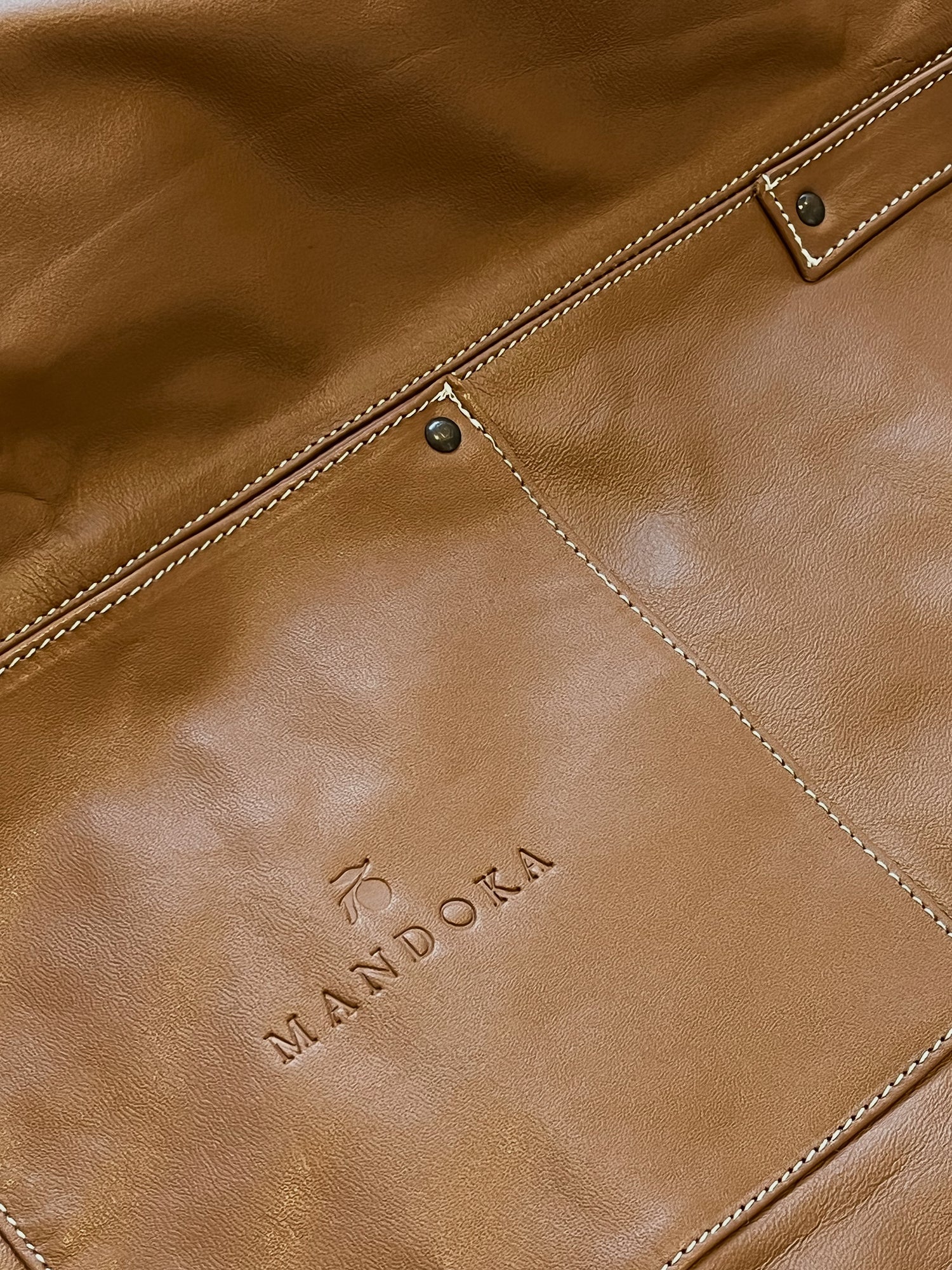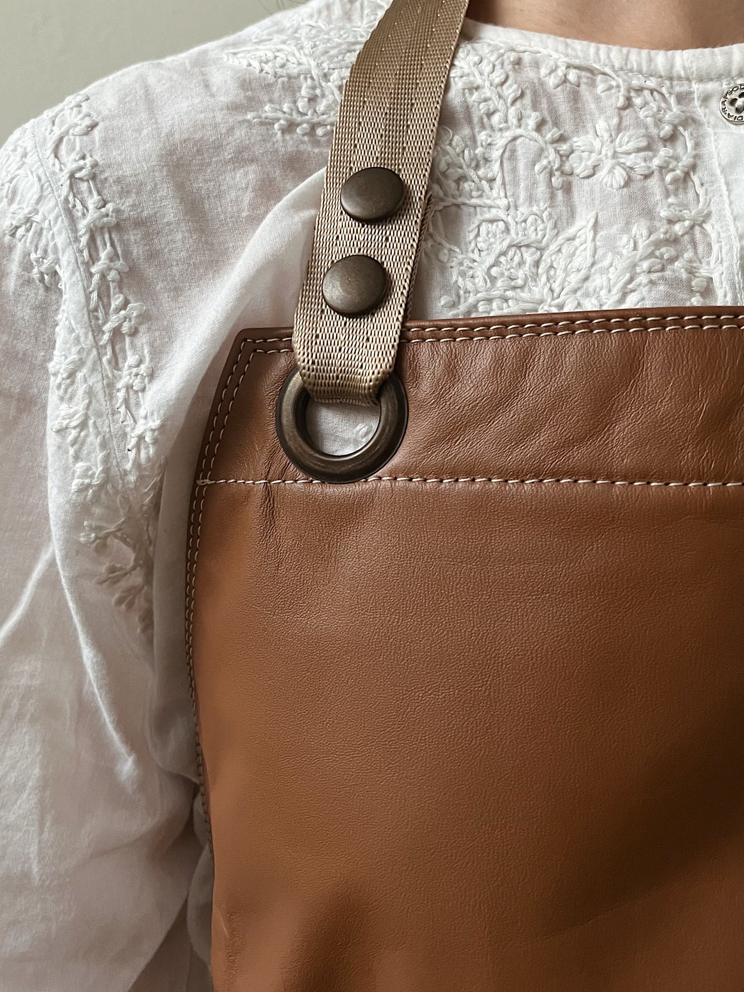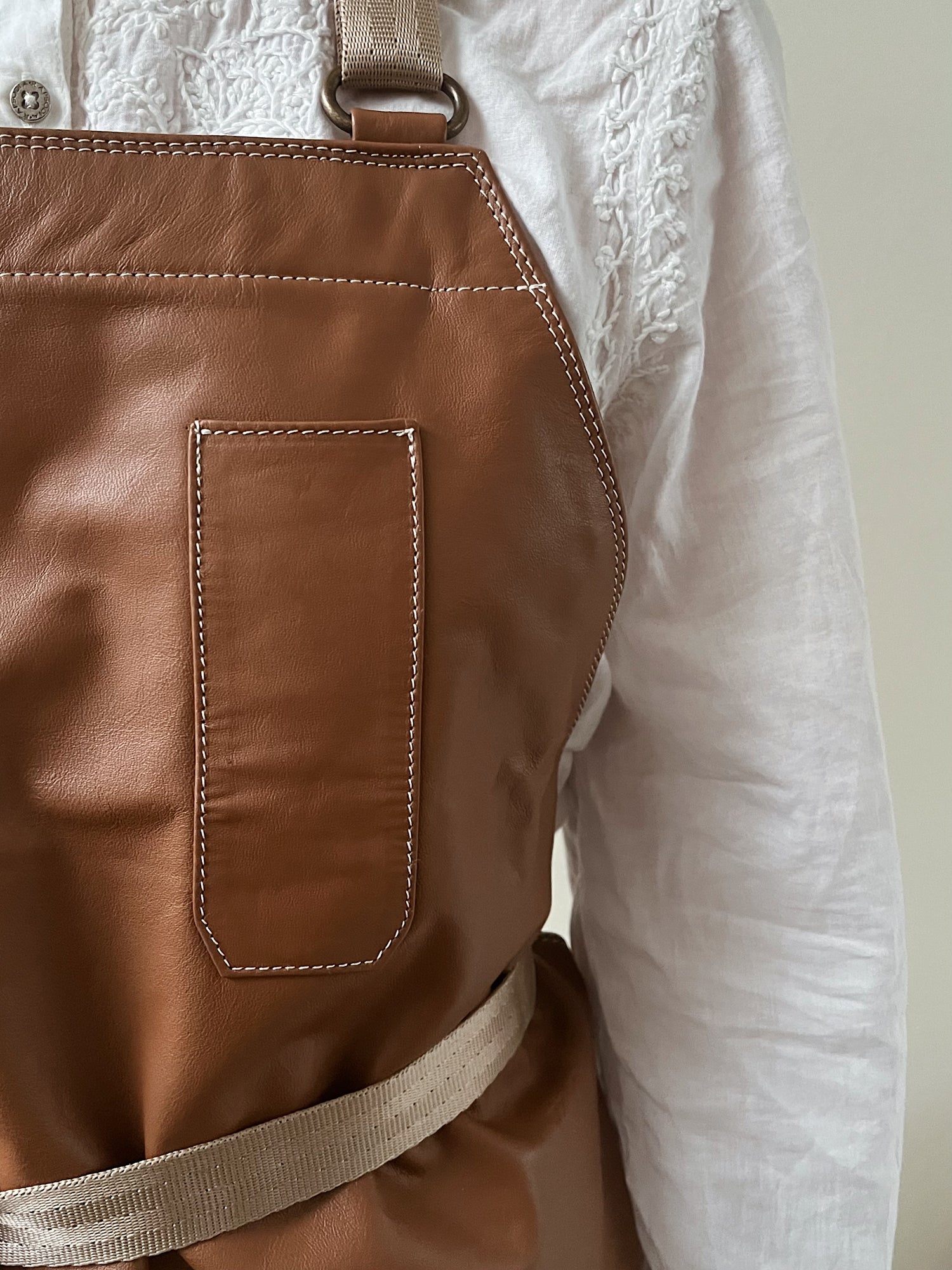 Está hecho con piel 100% natural (por lo que puede haber ligeras variaciones en el color) y pasa por un tratamiento para ser más fácil de limpiar. La piel es suave y muy ligera. La tira del cuello es ajustable y las de la cintura se pueden amarrar por delante o por detrás.