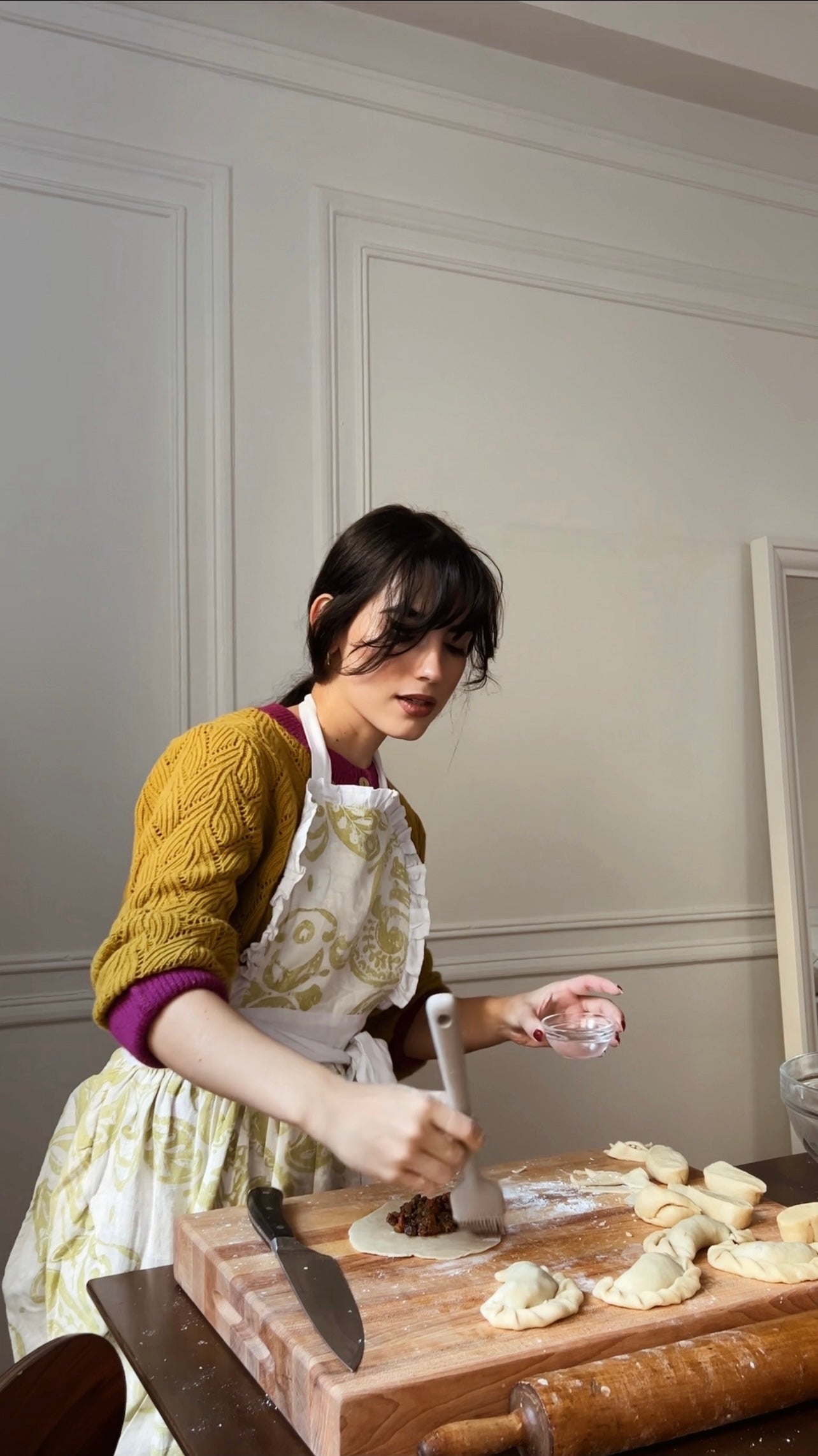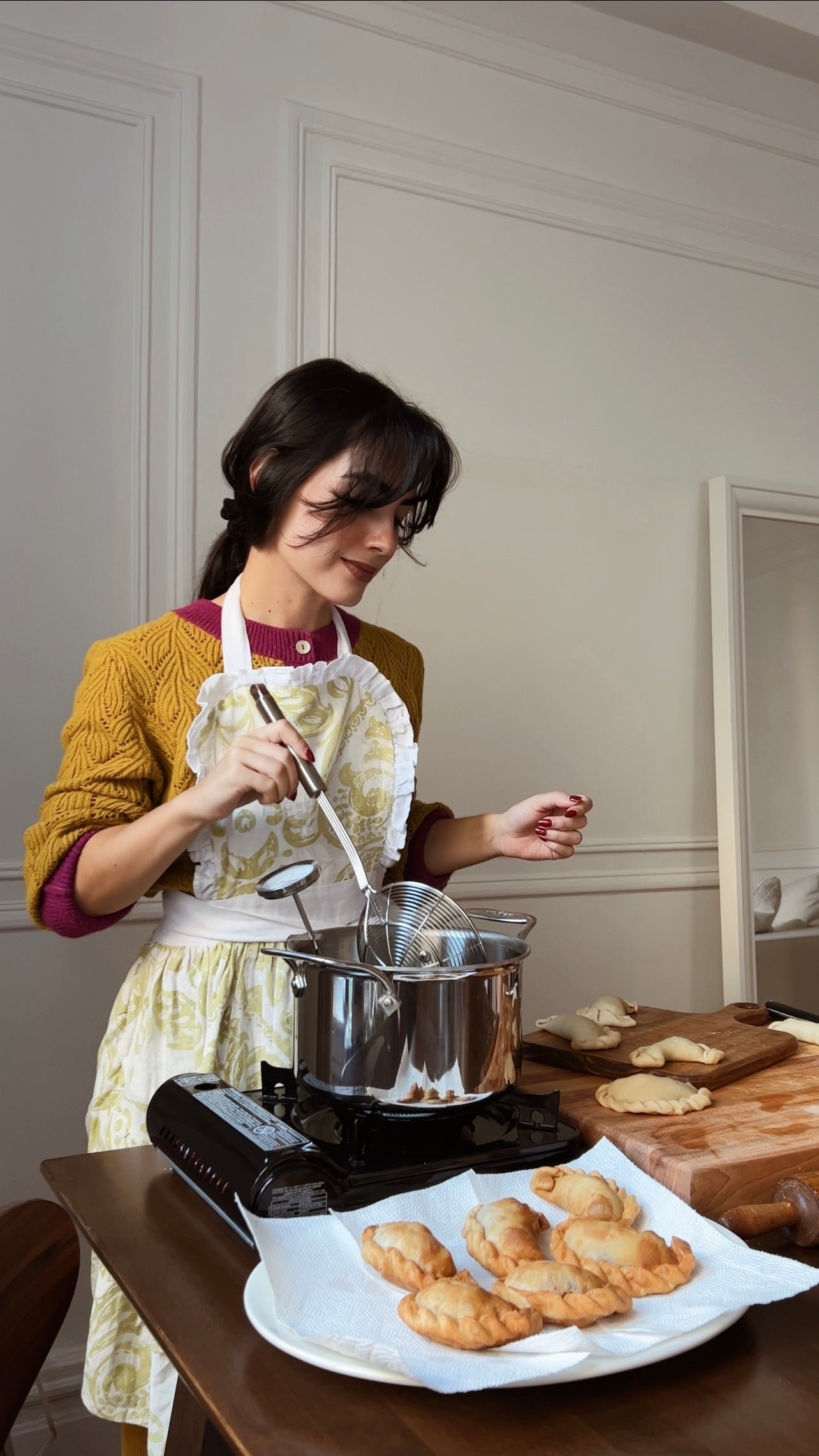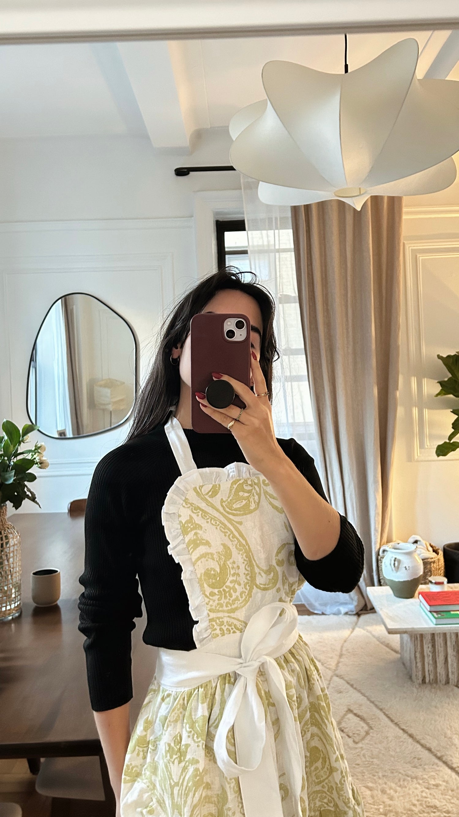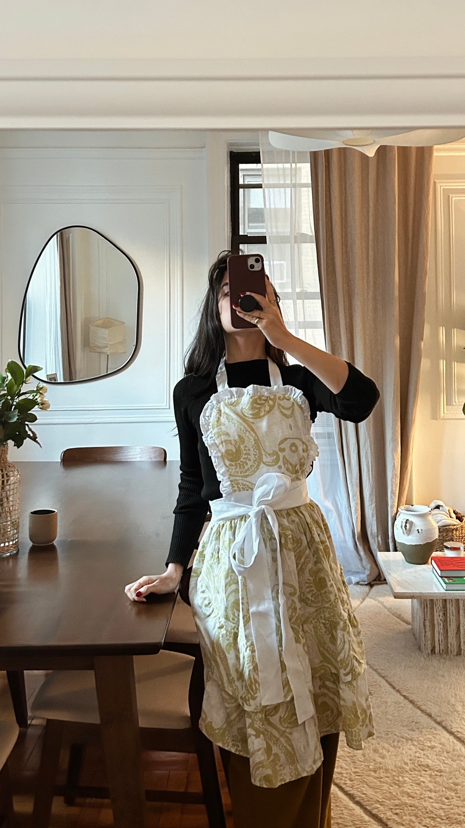 Duraznero es un delantal femenino y romántico. Nos recuerda a los delantales de antaño, cuando las mujeres usaban olanes y estampados al cocinar. Es sumamente ligero y fácil de quitar y poner.